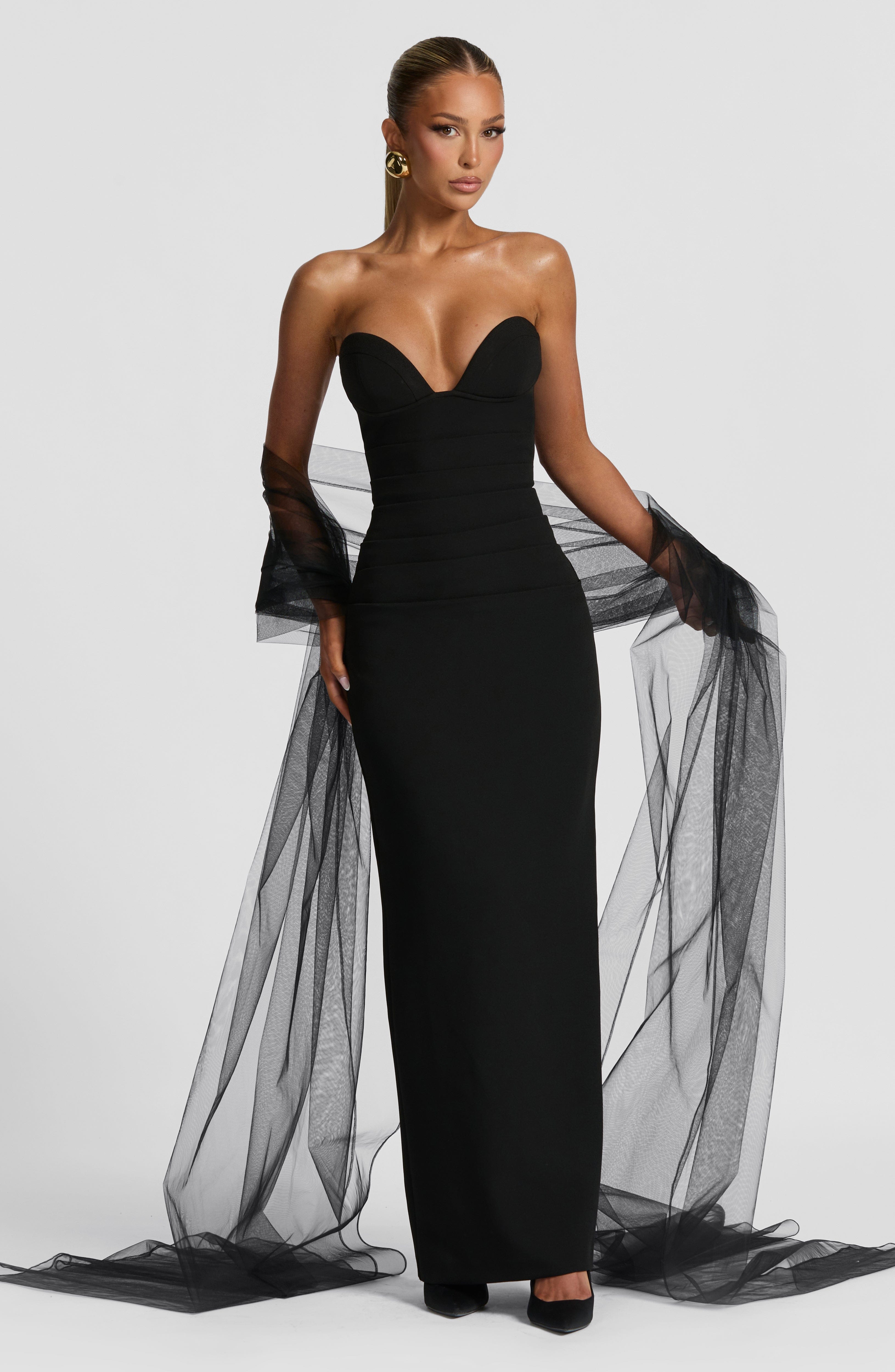 Elevate your ensemble with the Myrtle Shawl in black. Crafted from sheer. lightweight tulle. this extra-long shawl offers a graceful drape with moderate width. adding volume and elegance. Perfect to wear delicately over the arms or softly around the neck.