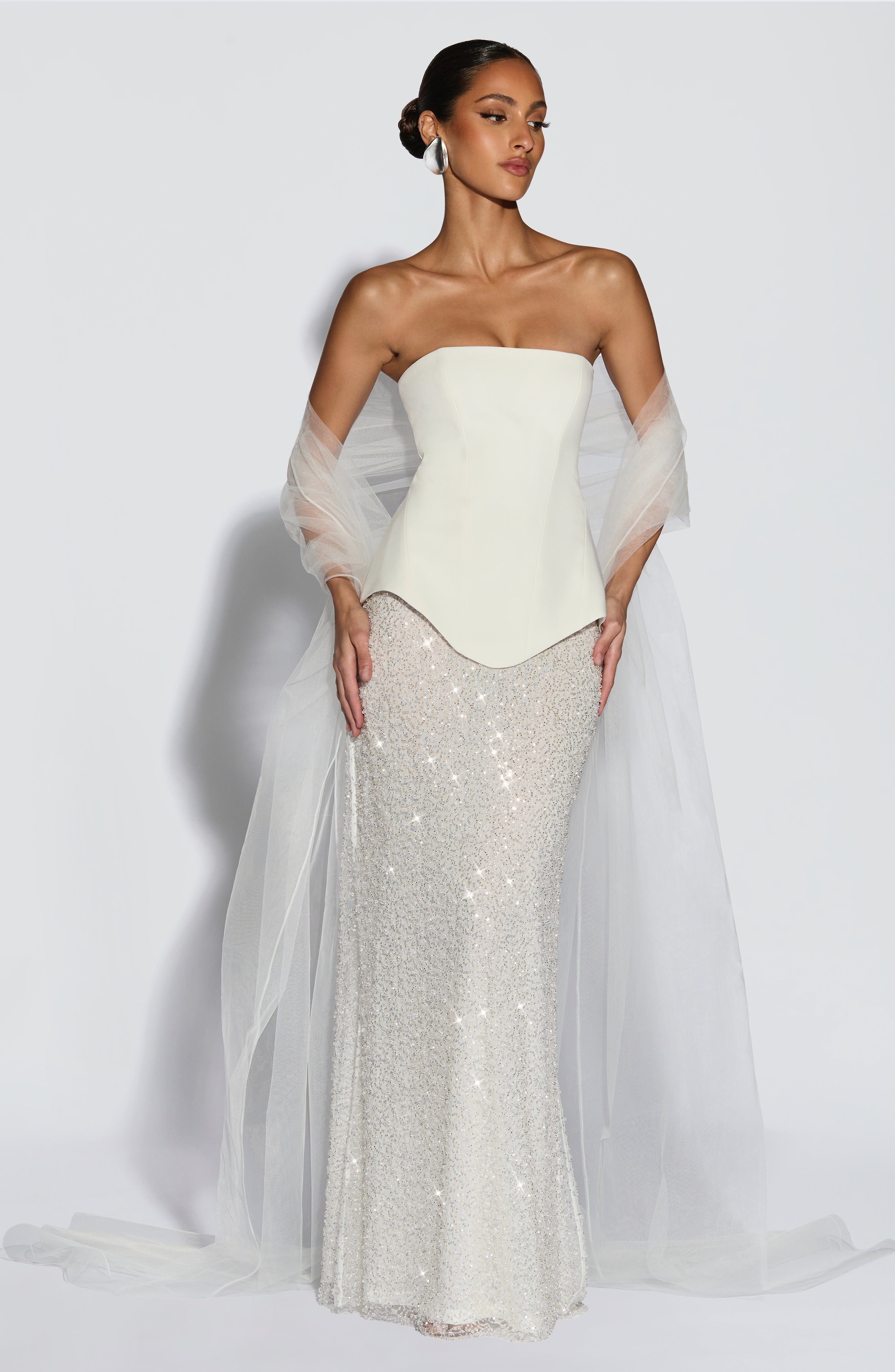 The Myrtle Shawl in Ivory is crafted from sheer. lightweight tulle. offering an extra-long length and moderate width for graceful volume. Designed to drape elegantly over the arms or around the neck. it provides a refined and sophisticated accessory to elevate any outfit.
